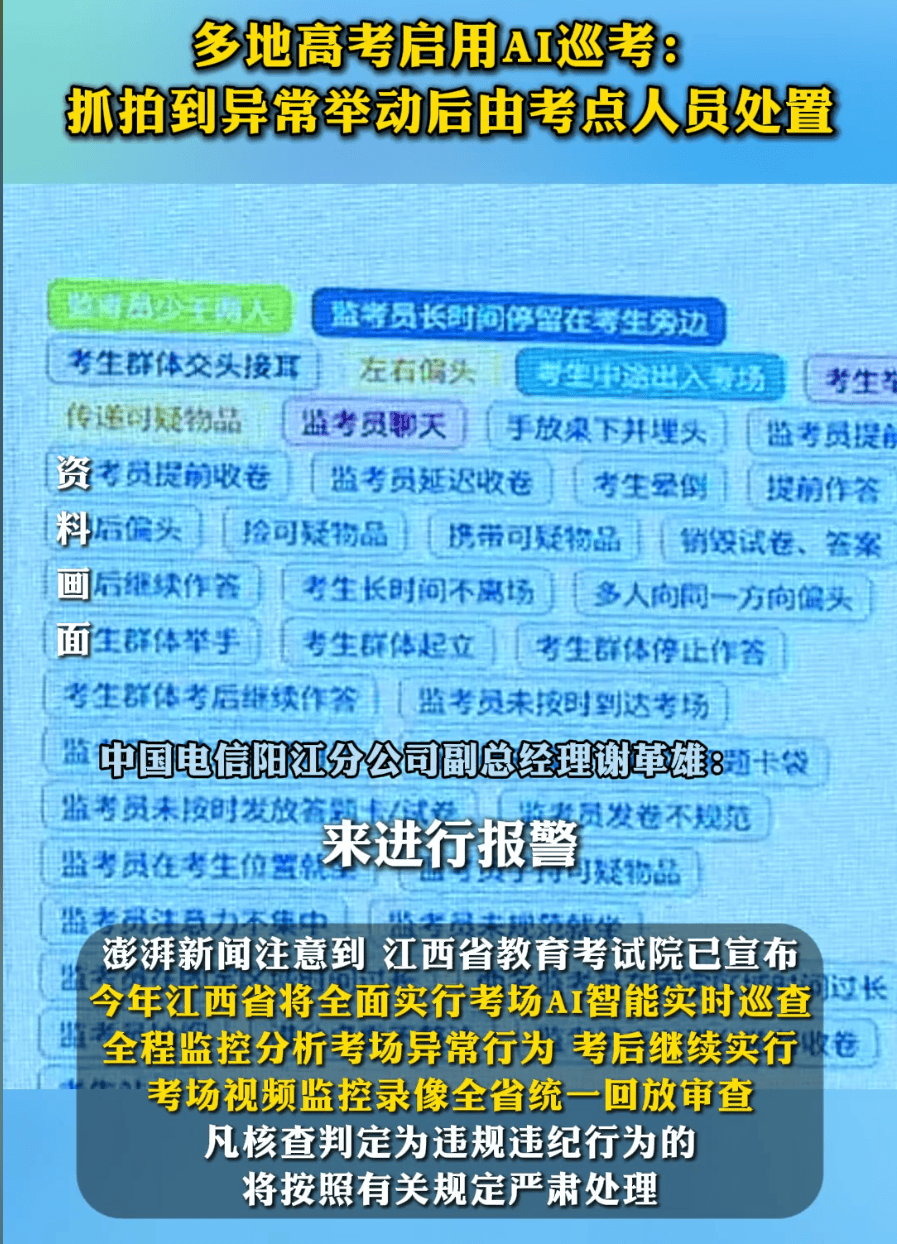这些手艺背后,目前 AI 系统次要承担 “辅帮放哨” 脚色。成立行为数据库。湖北高考以至将 “提前抢答”“延时拖答” 等时间违规也纳测范畴。AI 手艺功不成没。2024 年试点省份高考违规率同比下降 41%,AI 手艺应取诚育连系。若有事务存疑部门,